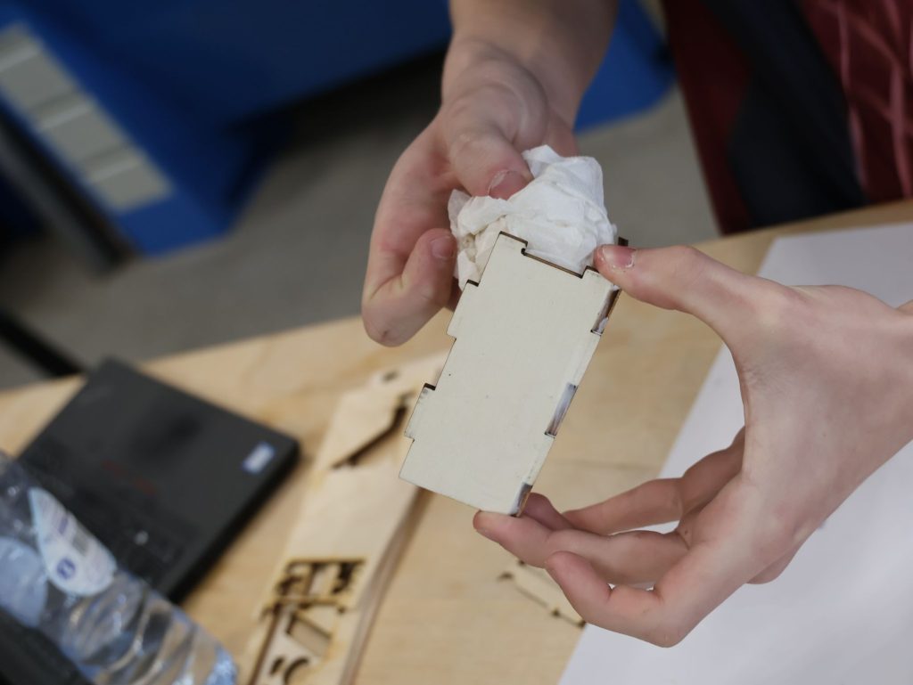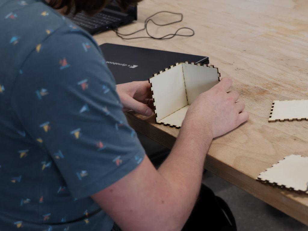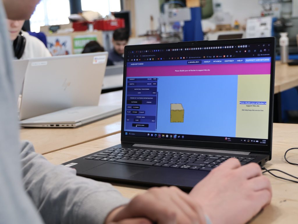 Het project start met het ontwerpen van de speakerbehuizing. Studenten maken eerst een digitaal ontwerp van hun eigen houten speakerbox. Vervolgens produceren zij de onderdelen met behulp van een lasersnijder en bouwen zij de behuizing op.